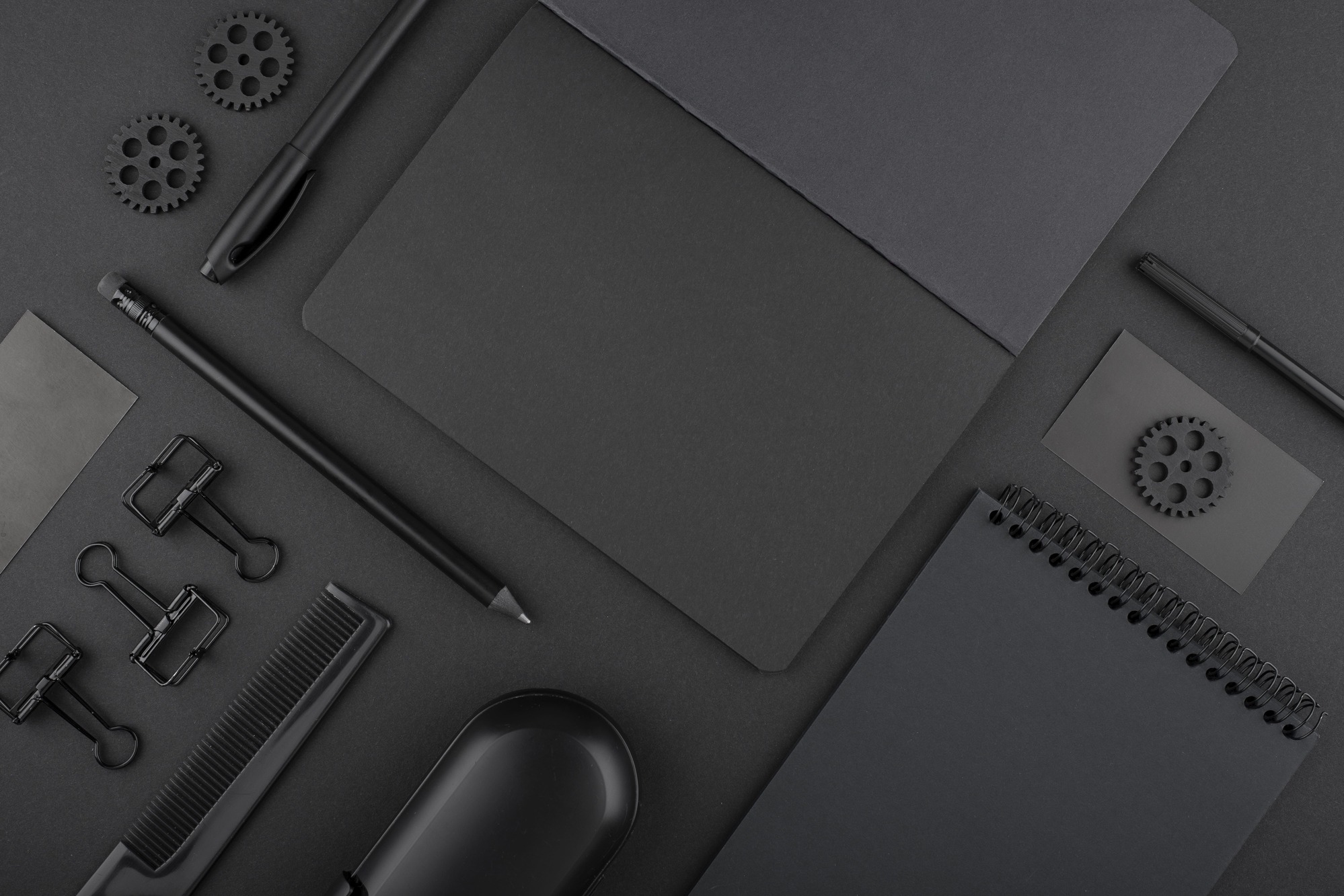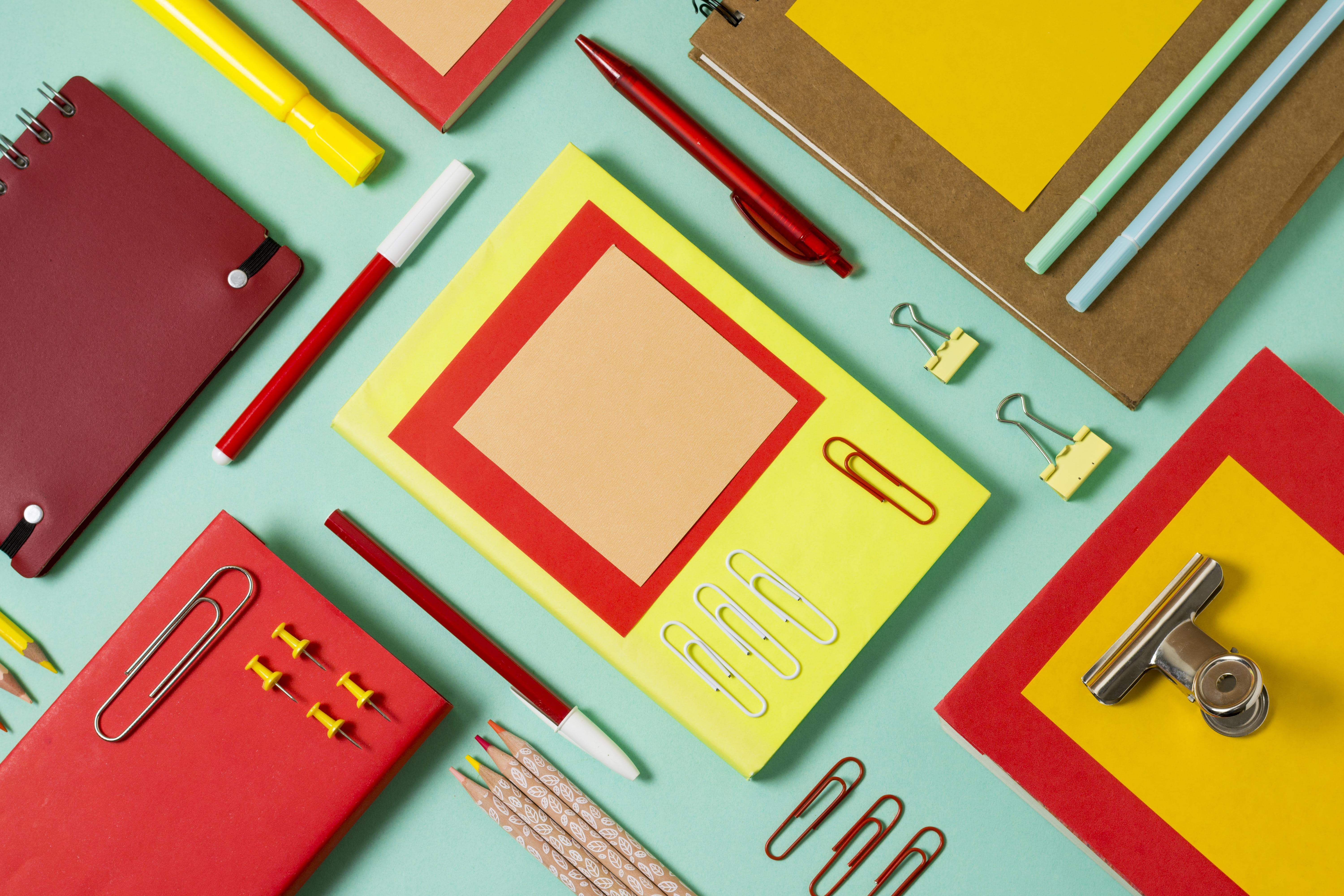 Pens, markers, notebooks and everyday office desk essentials.