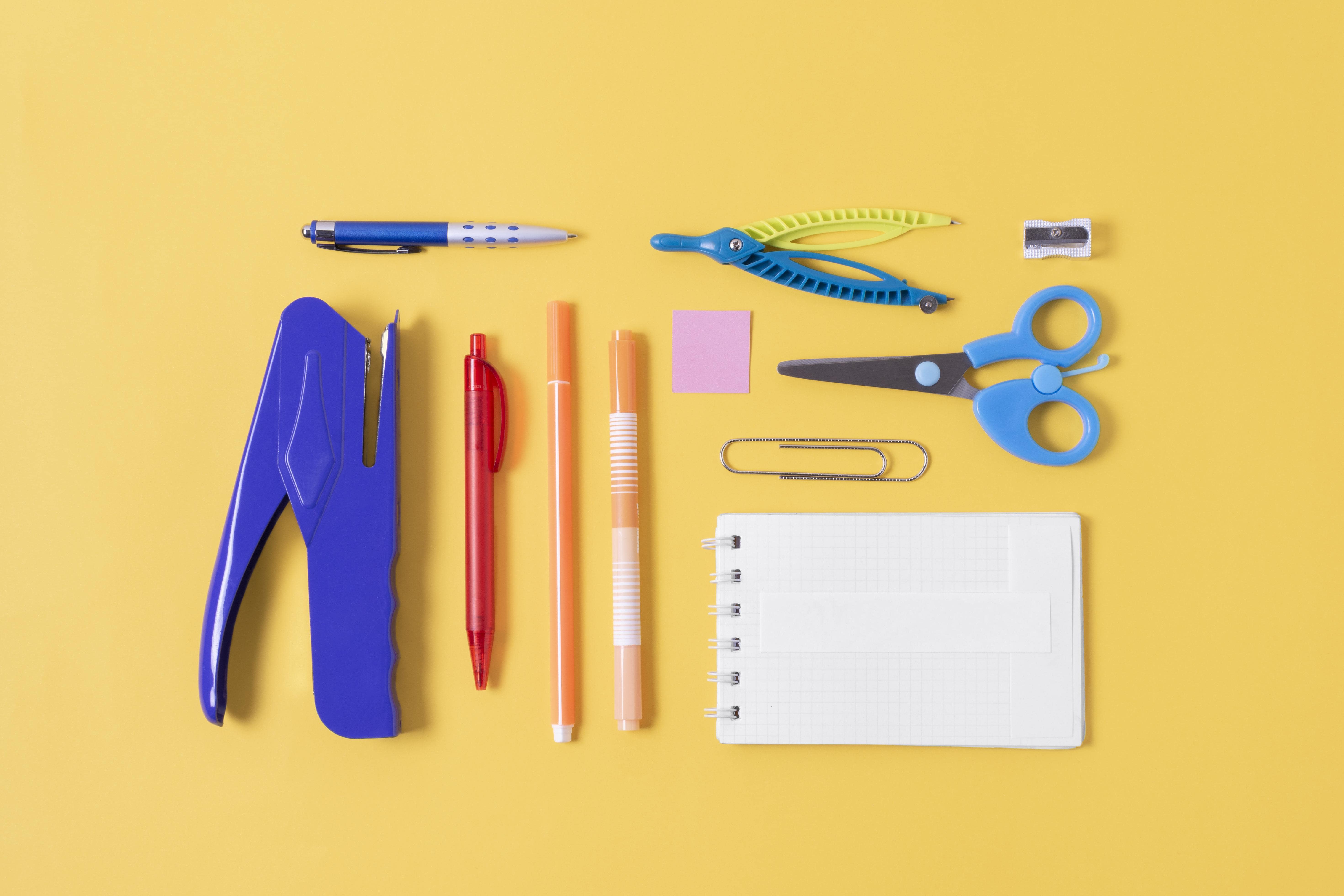 Pens, markers, notebooks and everyday office desk essentials.